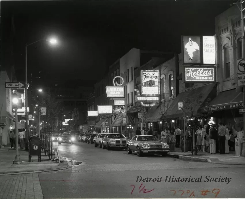 Black and white photo taken at night of Monroe Street, west from St. Antoine Street in Greektown. The Ambrosia Market, Hellas, the "Old" Parthenon, a grocery store, the Laikon Cafe, the International Restaurant, Olympic Electric Sign Service, the Athens Grocery and Bakery, and the Golden Fleece are on the north side of Monroe. Pedestrians, including a long line outside of Hellas, fill the sidewalks.