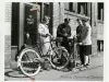 Black and white photograph showing a police officer inspecting a bicycle that's been turned upside outside a door marked, "8, Police Dept.," presumably as part of Pontiac, Michigan's World War II era effort to conserve rubber by curbing the use of automobiles. A young man and woman stand by beside the bike, as another young woman waits holding her bicycle. A boy peers out through the glass of the police department door. "Bill Fitzgerald," is stamped and "Pontiac, MI," is handwritten on the verso.