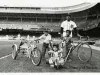 Black and white photographic print depicting Detroit Tiger Ron LeFlore with three disabled children, two tricycles and a bicycle on the field of Tiger Stadium. In the background are baseball players on the infield. The children are David Haller, Debbie Ott and Ron Haller.
