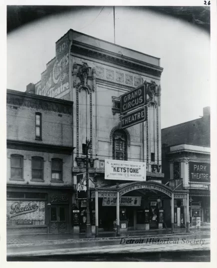 Black and white photo enlargement of a photo of the Grand Circus Theatre on the west side of Woodward Avenue north of Elizabeth Street, as taken from the east side of Woodward, facing west. Signs are posted around the entrance advertising the film "Old Dutch," and Keystone Cops shorts. The Bud Barker cafe is to left of the theater, and the Park Theatre is to the right. The photo is vignetted on its top edge. "1915," is handwritten on the verso.