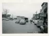 Black and white photo of Woodward Avenue, taken from the west side of the street, south of Alexandrine Street, facing south. A blank Walker & Co. billboard stands above a used car lot on the left. To the right is the Garden Theatre advertising "Design for Murder" and "Crimson Circle" on its marquee, and the Garden Bar. Traffic fills the street.