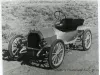 Black and white photographic print depicting a 1908 Bugatti parked in a desert setting.