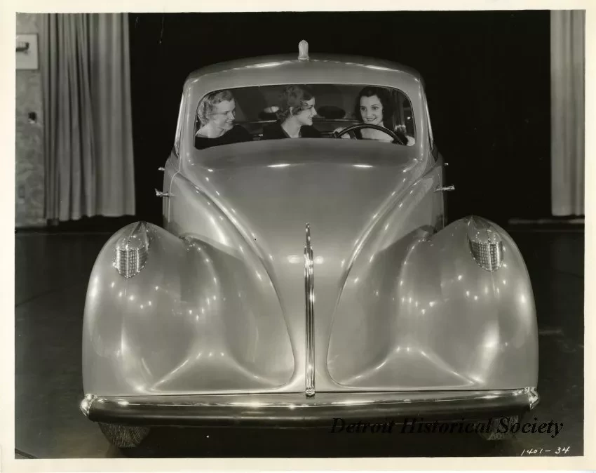 Caption reads: Plenty of Room for Three. Designing an automobile with all restrictions removed, the first thing the designer finds it possible to do is to widen the seats by streamlining the car to eliminate the running board. The roominess of the front seat of this car is apparent from the picture. It is a "dream car", designed by Briggs Manufacturing company and on display at the Ford Exposition of Progress at Convention Hall, Detroit. This car portrays Briggs' conception of the car of the future and does not represent a model for production by any manufacturer.