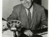 Black and white promotional portrait photo of WJR radio personality Edgar A. "Bud" Guest, Jr. seated behind a desk containing a WJR microphone, typewriter, and stack of paper and newspaper clippings. He wears a plaid suit, and tie. "Bud Guest," is printed along the bottom border of the photo. "Edgar 'Bud' Guest, May 9, 1975," is handwritten on the verso.
