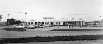 Print. (2 Copies.) Black and white photographic print of an exterior view of the Hudson's Tire Center, located in Northland Center at 21125 Greenfield Road, Southfield. A series of differing makes and models of automobile are parked outside of the service center. A woman can be seen exiting her car in the bottom left foreground. Various types of tires and hub caps are visible in the retail window.