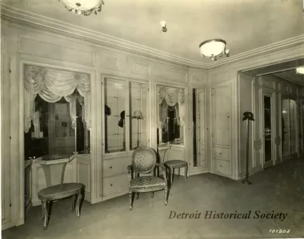 Print. Sepia-toned photograph of the interior of Newhauser Milgrom, located in the Fisher Building, as noted on the verso. Displayed in the interior are a series of cloche hats and dressing tables for women to try them on. Printed in the lower right corner of the recto is the photographic sequence number, "101203."