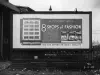 Black and white photographic print depicting a Walker & Co. billboard displaying an advertisement for D.J. Healy Shops reading, "D.J. Healy Shops, 8 Shops of Fashion, Downtown and in Your Neighborhood, You can depend on Healy quality".