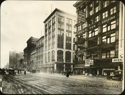 Sepia-toned photographic print depicting buildings and storefronts along Woodward Avenue. The camera was positioned just north of John R on the east side of Woodward, facing southwest. The Annis Fur Building, housing the Milton Corset Shop; Alex J. DeSaulier, a sewing professional; Stahl's Boot Shop; Albert W. Kludt, optician; the W.L. Douglas Shoe Company; the Ballantine Company Tailors; and Weyhing Brothers Manufacturing Company Jewelry, is on the northwest corner of Woodward and Clifford Street. To the south are the Woodward-Clifford Building, housing an S.S. Kresge Company Five and Ten Cent Store, and Kartsek's Cafeteria; the F.W. Woolworth Company Five and Ten Cent Store; Taylor's; Golden's; the Traugott Schmidt Building; a drug store; Central Lunch; George Yost, Furrier; and Fields Dresses. Pedestrians and automobiles are in the streets, traveling through the snow. The image is surrounded by a thick black border. "Woodward Ave & Clifford, 1916, Woolworth-Kresge Southwest corner, Douglas-Annis northwest corner" printed on verso along with "neg av."