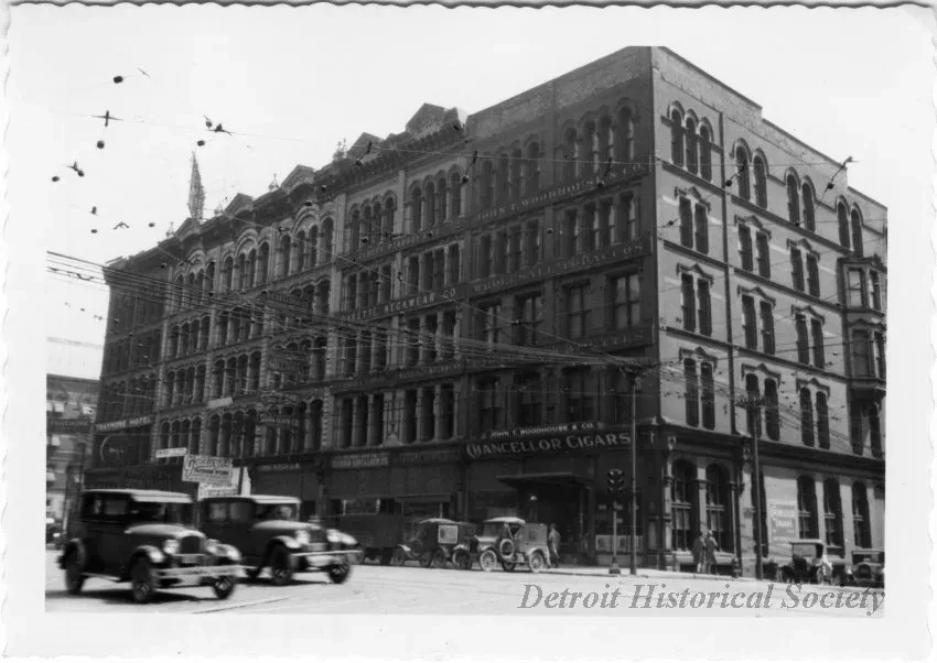 Black and white photographic print depicting a row of buildings containing storefronts on the south side of West Jefferson Avenue between Woodward Avenue and Griswold Street. The pictures businesses include John T. Woodhouse and Company; Cluett, Peabody, and Company; Payette Neckwear Company; Diebold Safe and Lock Company; D.E. Kellogg Company; the Shade Cloth Company; Goldwyn's Outdoor Store; and the Traymore Hotel. Early automobiles are parked on the street, and two pass from the lower left. The photo has a deckled edge. "1930" is handwritten on the verso.