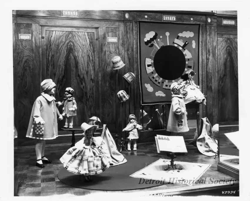 Print. Black and white photographic print of a window display at B. Siegel Company Department Store. Young girl mannequins are dressed in the latest fashions surrounded by dolls. Embossed in the lower left corner of the recto is the name and location of photographer, "Manning Bros. Detroit." Also, printed in the lower right corner of the recto is the photograph sequence number, 85998." Written on the verso, is a date of 9-9-27."