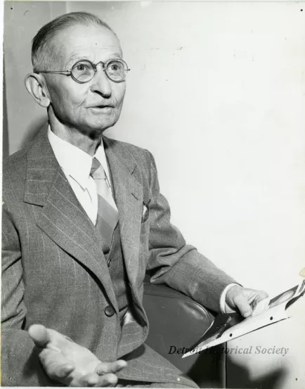 Black and white photo of Thomas E. Clark wearing in glasses and dressed in a three-piece suit and tie and holding a pamphlet. Lower right corner of photo embossed with "The Detroit News, Detroit, Mich."