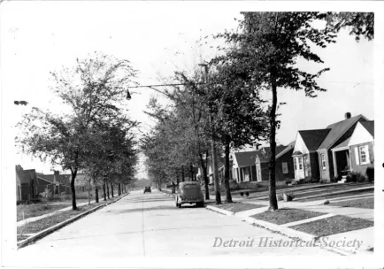 Print. Black and white photographic print depicting a view along an unidentified residential street lined with bungalows. A street light composed of a wooden pole, from which a long arm extends at a right angle which supports a downward pointing light. A second angled arm supports the main arm, extending from several feet below, to roughly three-quarters of the length to the light.