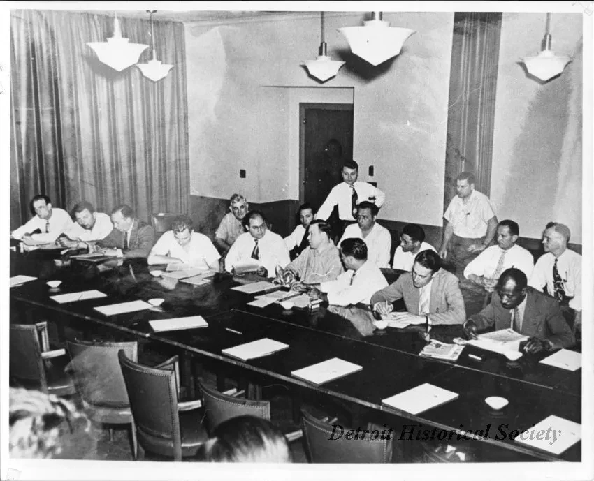 Print. Black and white copy of a photographic print depicting the 1949 UAW Ford Negotiating Committee, as indicated by a handwritten note on the verso. The verso also lists those pictured. The front row from left to right is an unidentified man (Jim Warren), Virgil Lacey, Percy Llewellyn, Jack Conway, Ken Bannon, Walter P. Reuther, Gene Prato, Carl Boyle, Shelton Tapper. The back row is listed as Frank Davis, A. DeMardo, Jim Sullivan, Nat Weinberg, Lew Michener, and an unidentified man (Carter Page). Art Valenti is listed as standing. Jim Hamby is also standing. The men are gathered around one side of a long conference table. The other side is empty, aside from pads of paper, pencils, and ash trays. The tops of two heads are in the foreground at the lower left.