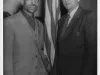 Print. Black and white photographic print depicting Shelton Tapper and Carl Stellato posing in front of a United States flag. "R.S. Black, Photo," is embossed into the lower right, and "Colgate Photo." is stamped on the verso.