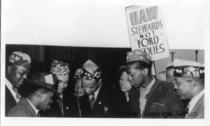 Print. Black and white copy of a photographic print depicting a group of United Auto Workers - Congress of Industrial Organizations members wearing garrison caps decorated with pins, as well as a man wearing a fedora with a card inserted into its band peering below frame. "Local 208," and "Local 600," are embroidered on two of the caps. A sign which reads, "UAW Stewards Not Ford Stoolies," is held in the background, and has been made to stick out above the rest of the frame, through the cutting away from everything above head level. "7-1-65 #9," is handwritten on the verso.