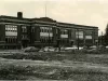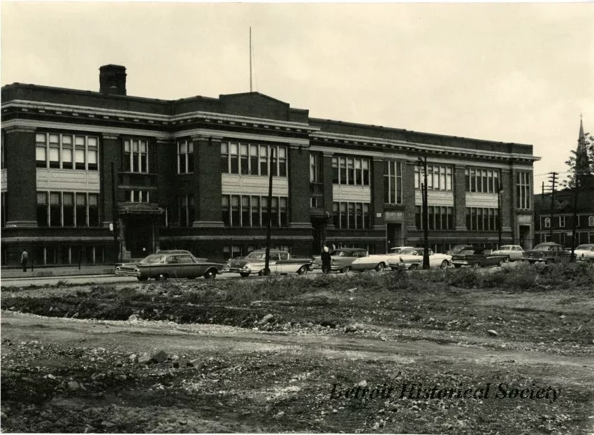 Large monochromatic photographic print of the exterior of a two story brick school or hospital, as viewed from an adjacent gravel-covered lot. A row of 1950s automobiles are parked in the street. Several children stand outside of the building, a church steeple resembling one of Ste. Anne's Catholic Church's is visible in the background along the right edge of the frame.