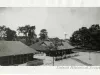 Large monochromatic photographic print of two small buildings of the Herman Kiefer Hospital Complex, taken from an elevated position. Folding chairs are set up on the shaded porches of both buildings. A woman sits under a tree on a lawn in the background. "Herman Kiefer Hospital 1913," is handwritten on the verso.