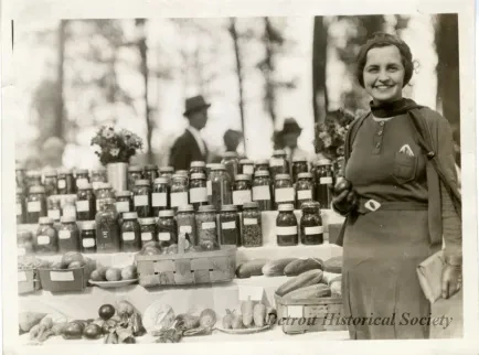 Sepia-toned photographic print taken of a smiling woman posing to the right of a table covered fresh produce and a variety of jarred goods. She wears a long dress, jacket, hat, scarf, and gloves and holds what appears to be a tomato. Several other people in hats and suits as well as trees are visible in the background. "1931," is handwritten and "42," is stamped on the verso.