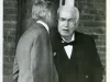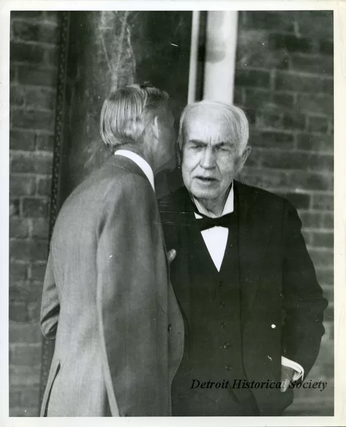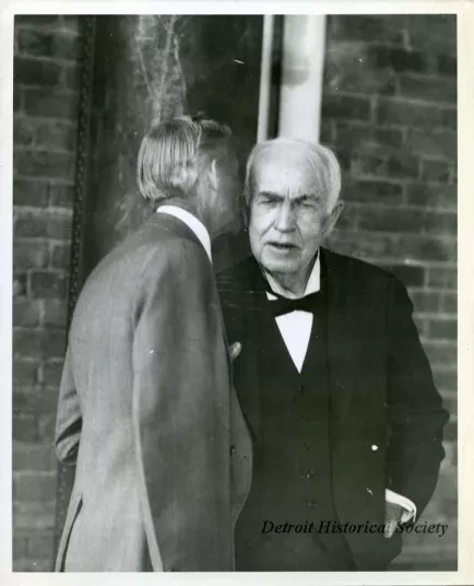 Photograph. Black and white photo showing Henry Ford (left) speaking into the right ear of Thomas Edison (right). A brick wall can be seen in the background. Henry Ford is wearing a grey suit and Thomas Edison is wearing a white shirt with dark-colored suit and tie. A typewritten label on the verso shows "No. 5495. Left to right: Henry Ford and Thos. A. Edison in the reproduced Edison Laboratory from Ft. Myers, Fla., now in Geenfield Village, Dearborn, Mich., on Sept. 27, 1928, just before Mr. Edison opened the throttle on the Armington & Sims steam engine to put the Laboratory in operation again. Mr. Ford is telling Mr. Edison that everything is ready for him to start the engine. Due to Mr. Edison's deafness, it was necessary to get close to him so he could hear."
