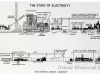 Photograph (and 1 copy). Black and white photo of a schematic drawing that shows the general operation of a coal-burning electric power plant. The view shows coal being unloaded from a freighter at the upper left side of the image. The coal is then carried by elevating conveyors to the plant where it is burned in order to produce thermal energy to boil water and thereby create pressurized steam. The steam turns the turbines which drive the generating units in order to create electricity. The electricity then leaves the plant where it is sent out to the service grid via a network of transmission lines and substations that ultimately brings the electricity to the customer (industrial, farm, commercial, residential).