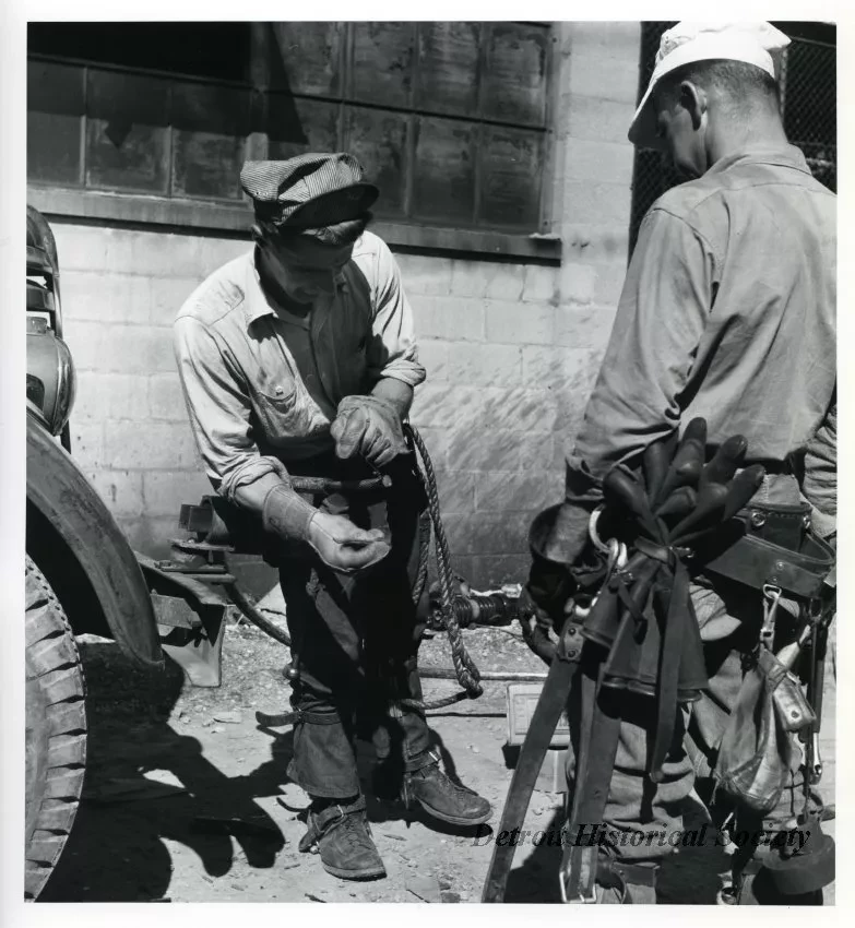 Photograph. Black and white photo showing a Detroit Edison lineman who is working on the end of an electrical cable. The lineman, Jim Nance, has clamped the end of the cable in a vise that is located at the front end of a truck. The cable insulation has been removed and it appears that he is using a strip of sandpaper to clean the bare wire. Another lineman is observing the work. Both men are wearing work clothes, climbing spikes, tool belts, heavy gloves, and hats. A concrete block building with dirty windows can be seen in the background.