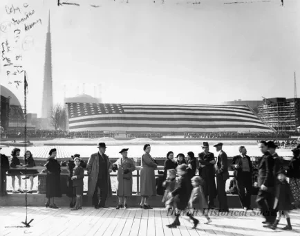 Print. Black and white photographic print of a series of pedestrians standing on the far eastern side of the Lagoon of Nations prior to the opening of the World's Fair; pedestrians are visible around the lagoon, and the Hudson's Flag neighbors the western edge of the lagoon. Construction on the Trylon and Perisphere, components of the Theme Center can be seen in the background, behind the flag. Editorial notations can be seen on the upper left side of the photograph. The photographer's name and geographic location are stamped on the verso, "Credit: Victor De Palma, from Black Star, Graybar Building, New York." Also, the date and time are stamped on the verso, "1938, Dec 3, PM 4 32."