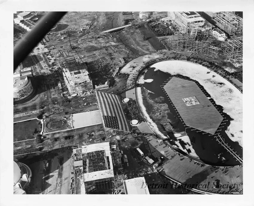 Print. Black and white photographic print, taken from an aerial vantage point, of the Hudson's Flag, displayed in Flushing Meadows - Corona Park, New York, along the rim of the Lagoon of Nations. A large gathering of people stand in front of the flag during the Armistice Day Dedication of the Fair's Peace Court. Construction of the many World's Fair buildings is occurring during the dedication.