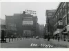 Black and white photo of taken along Gratiot Avenue, facing southwest from Randolph Street. On the right are several storefront businesses including Meyer the Tailor, Morris Furs, Wormser Hats, a sign company, and a shoe repair business, as well as the Tobin Building. On the opposite side of Gratiot are William Broad's 5¢ and 10¢ Variety Store, the Cadillac Furniture Company, United Shirts, and Crowley-Milner's. Kern's stands in the distance where Gratiot bends at Farmer Street. Pedestrians and cars are in the streets. "840 - 3/19/45" is printed near the bottom of the photo.