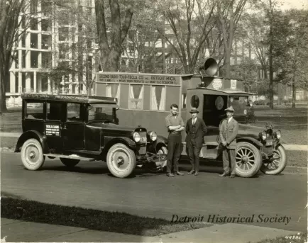 Sepia-toned photo of Thomas E. Clark and two other men posing between a Tecla Company car and truck used in the Second Radio Tour, on Second Avenue with Cass Park and the construction of the Masonic Temple in the background. The car is a Rickenbacker, outfitted with a loop antenna around its roof, and marked with a sign just below reading, "Tecla Co., Inc., Thos. E. Clark, Pres., Detroit, Mich., Mfrs. Radio Products, In Radio Since 1900." Another sign on the passenger door reads, "Thos. E. Clark, Powered Radio Mfr. In Radio Since 1900, Detroit, Mich." The truck is also outfitted with a loop antenna around its roof, as well as a cone-shaped horn speaker above its cab. A sign along the top of the truck reads, "Second Radio Tour, Tecla Co., Inc., Detroit Mich., Thos. E. Clark - Pres - Mfgrs Radio Products since 1900 - D.C. Scranton, Rep." The truck also bares AAA, Detroit Automobile Club" signs on the front and side of the cab. The man on the left wears a shirt with the sleeves rolled up. Thomas E. Clark, in the center, wears a fedora and a dark suit. The man on the right wears a cap and suit. "49381," is printed in the lower right corner of the photo. The picture is mounted on linen with a flap with two holes punched in it along the left edge. "Tecla Company, Inc., 1507 Cass Ave., Detroit, Mich." is stamped on the verso.