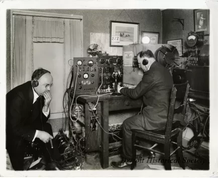 Black and white photo captioned in handwriting on verso as "Clyde E. Darr, one of Detroit's leading amateurs and his home transmitter station at 137 Hull Avenue." Darr sits on the left holding a cigar and listening through headphones, while another man seated at a table covered with radio equipment, including a transmitter bearing a plaque which reads, "The Darr Radiophone and Telegraph Transmitter," sits with his back to the camera holding a slip of paper and also listening through headphones. A map, a framed print of men in a canoe with a sign baring Darr's call sign, "8ZZ," several certificates, and a photo of a little girl are hung on the wall. "Photograph by The Detroit News," is stamped on the verso.