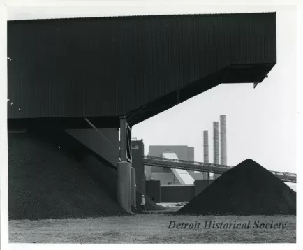 Photograph. Black and white photo of the coal storage area at the Detroit Edison St. Clair electric power plant. The view shows coal piles and handling equipment in the foreground as well as one workman who is inspecting one of the coal piles. Coal conveyors and the power plant building can be seen in the right background area of the photo.