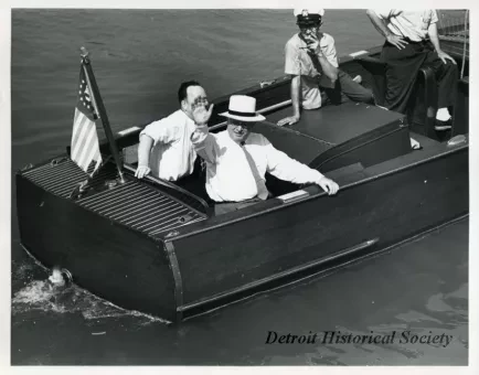 Photograph. Black and white photo showing a classic wooden runabout that is moving slowly on the Detroit River. The view shows a captain and one crew member who are operating the boat while two male passengers (in dress attire) are seated in the back. The boat has a U. S. yacht ensign on the stern. It is a clear, calm, and sunny day on the river. The two passengers on the boat are probably company or municipal officials who are observing the raising of aerial power lines that are to be placed across the river between the Detroit Edison Delray power plant and the Ontario Hydro J. C. Keith Generating Station in Windsor.