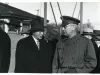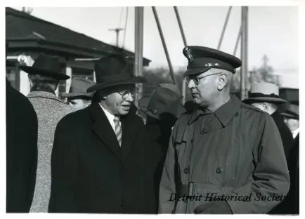 Photograph. Black and white photo showing a group of men who are attending the "Partners in Progress" dedication ceremony for the two recently completed power interconnections between the Detroit Edison Company and Ontario Hydro. One interconnection was made across the Detroit River between the Detroit Edison Delray electric power plant and the Ontario Hydro J. C. Keith Generating Station in Windsor, Ontario. The other interconnection was made across the St. Clair River between the Detroit Edison Marysville electric power plant and Ontario Hydro transmission lines located just south of Sarnia, Ontario. The ceremony was held on December 18, 1953, at the Marysville power plant. The two men in the foreground are not identified.