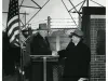 Photograph. Black and white photo showing speakers and attendees at the "Partners in Progress" dedication ceremony for the two recently completed power interconnections between the Detroit Edison Company and Ontario Hydro. One interconnection was made across the Detroit River between the Detroit Edison Delray electric power plant and the Ontario Hydro J. C. Keith Generating Station in Windsor, Ontario. The other interconnection was made across the St. Clair River between the Detroit Edison Marysville electric power plant and Ontario Hydro transmission lines located just south of Sarnia, Ontario. The ceremony was held on December 18, 1953, at the Marysville power plant. The two men who are shaking hands at the lectern are: Walker L. Cisler, President of Detroit Edison (left) and Robert H. Saunders, Chairman of Ontario Hydro (right). An American flag and ceremony attendees can be seen in the left background area of the photo. The unveiled "Partners in Progress" monument can be seen at the right side of the photo.