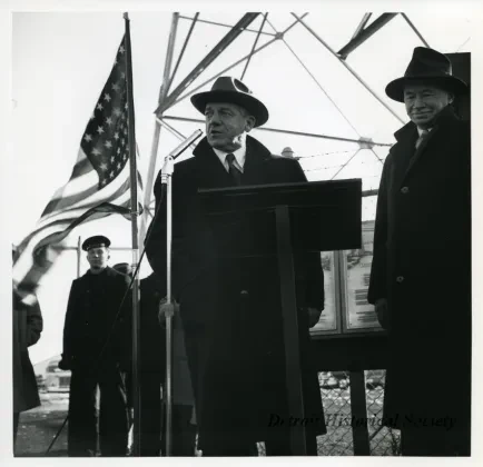 Photograph. Black and white photo showing a speaker and attendees at the "Partners in Progress" dedication ceremony for the two recently completed power interconnections between the Detroit Edison Company and Ontario Hydro. One interconnection was made across the Detroit River between the Detroit Edison Delray electric power plant and the Ontario Hydro J. C. Keith Generating Station in Windsor, Ontario. The other interconnection was made across the St. Clair River between the Detroit Edison Marysville electric power plant and Ontario Hydro transmission lines located just south of Sarnia, Ontario. The ceremony was held on December 18, 1953, at the Marysville power plant. The speaker at the lectern is Robert H. Saunders, Chairman of Ontario Hydro. The man who is standing on the right side of the photo in front of the unveiled "Partners in Progress" monument is not identified. An American flag and ceremony attendees can be seen in the left background area of the photo.