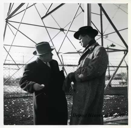 Photograph. Black and white photo showing two men who are attending the "Partners in Progress" dedication ceremony for the two recently completed power interconnections between the Detroit Edison Company and Ontario Hydro. One interconnection was made across the Detroit River between the Detroit Edison Delray electric power plant and the Ontario Hydro J. C. Keith Generating Station in Windsor, Ontario. The other interconnection was made across the St. Clair River between the Detroit Edison Marysville electric power plant and Ontario Hydro transmission lines located just south of Sarnia, Ontario. The ceremony was held on December 18, 1953, at the Marysville power plant. The men are: Walker L. Cisler, President of Detroit Edison (left) and G. Mennen Williams, Governor of Michigan (right). The base of a steel lattice transmission line tower can be seen in the background on the Marysville power plant property.