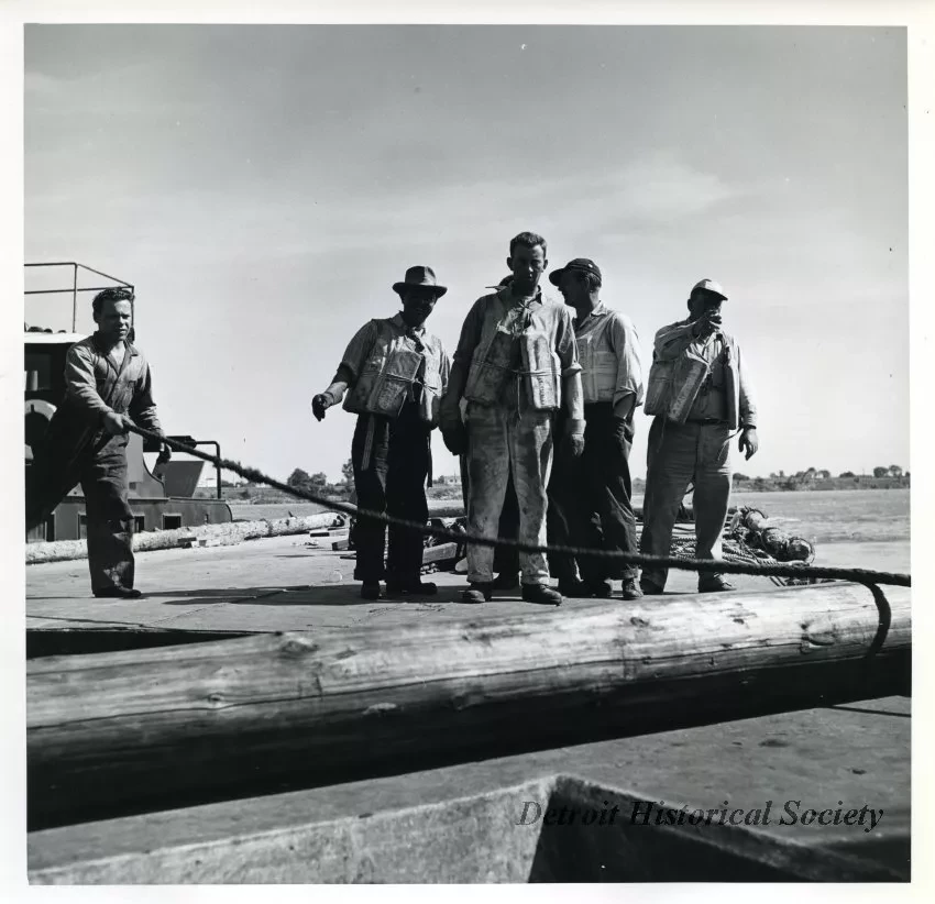 Photograph. Black and white photo showing a group of six workmen on the dock at the Detroit Edison Marysville electric power plant. The workmen are assisting in the construction of aerial power lines across the St. Clair River which will form an interconnection between the Marysville electric power plant in Detroit and Ontario Hydro transmission lines located just south of Sarnia, Ontario. The pilothouse of the tugboat, G. F. Becker, can be seen at the far left side of the photo. The St. Clair River and Canadian shoreline are visible in the background.