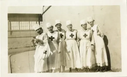 Sepia-toned photograph of the charter member of the Michigan Central Railroad Red Cross Canteen's Monday shift. Six women pose in Red Cross nurse uniforms beside a wall outside of Michigan Central Station.