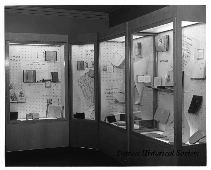 Black and white photographic print of the Collector's Corner Exhibit entitled, "Cookbooks Galore!" featured inside the Detroit Historical Museum, May - August 1964. Cookbooks from the collection of Mrs. Howard Peckham are displayed throughout the exhibit.
