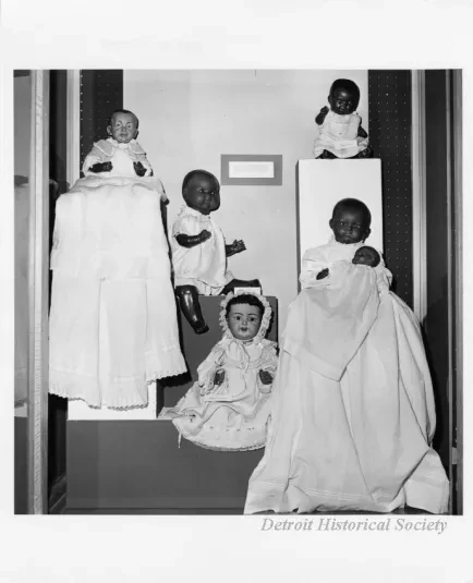 Black and white photographic print of the Collector's Corner Exhibit which features the "Black Doll Exhibit," displayed inside the Detroit Historical Museum, May - August, 1974. Signage affixed to the rear of the display reads, "Baby dolls that looked more like real babies became popular in the 1920s. These black baby dolls were all made in the 1920s. Although some were assembled and sold by American companies, the porcelain heads were made by German manufactures."