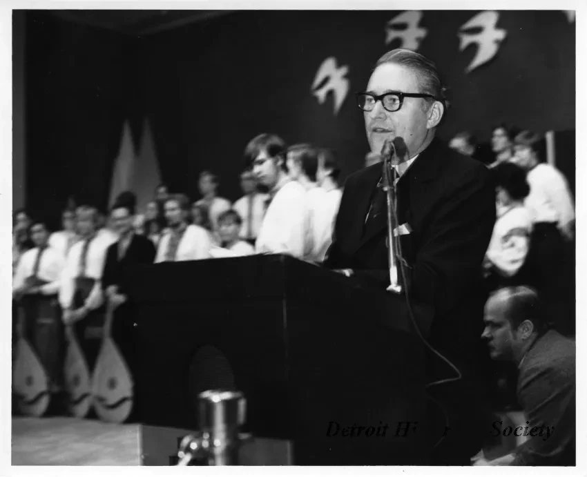 Black and white photographic print of Mr. Walter J. Murray, Detroit Historical Society President; speaking at the podium in the right foreground. Left of Mr. Murray, are members of the Bandura Chorale from St. Mary's Ukrainian Orthodox Church, who performed at the Christmas Open House, held at the Detroit Historical Museum, 1972.