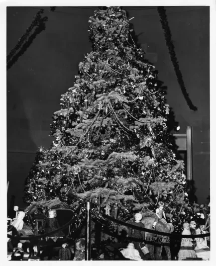Black and white photographic print of the large, decorated Christmas tree, inside Round Hall, at the Detroit Historical Museum, 1976.