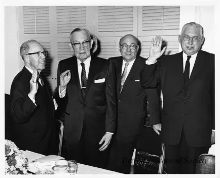 Black and white photographic print of four men, with their hands raised, standing on the opposing side of a banquet table, at the Detroit Historical Commission 20th Anniversary Dinner. From left to right, Thomas Leadbetter, George Stark, Leonard Simons, and Hozen Kunz. Stamped on the verso, "Jan. 10 1966, M-1520-20, Dept. Report & Info. Comm."