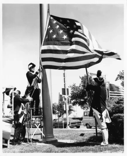 Black and white photographic print of the 175th Anniversary commemorating the taking of the city of Detroit from the British. Three military reenactors are featured putting up the fifteen-star American flag. Typed on the verso, "15-star version of Old Glory goes up. City-County Building - Detroit, Mich. Commemorating 175th anniversary of Gen. "Mad" Anthony Wayne's taking control of Detroit from the British. Fred Whitman, Jim Ciarantaro and David Howard. July 11, 1971."