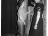 Black and white photographic print of Miss Peggy J. Lewis, dressed as a Native American, speaking with Mrs. Gunnar Karlstrom beside an exhibit, at the 200th Anniversary reception of the Pontiac Uprising, May 7, 1963.