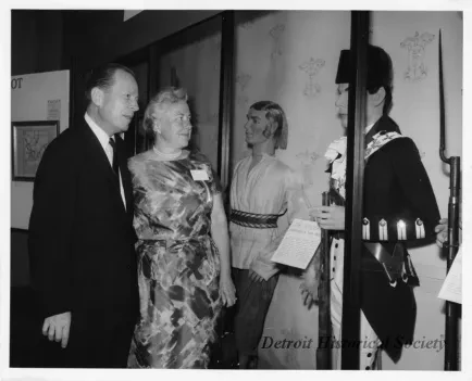 Black and white photographic print of Mr. and Mrs. Ray Eppert, viewing an exhibit, during the reception for the 200th Anniversary of the Pontiac Uprising, May 7, 1963.