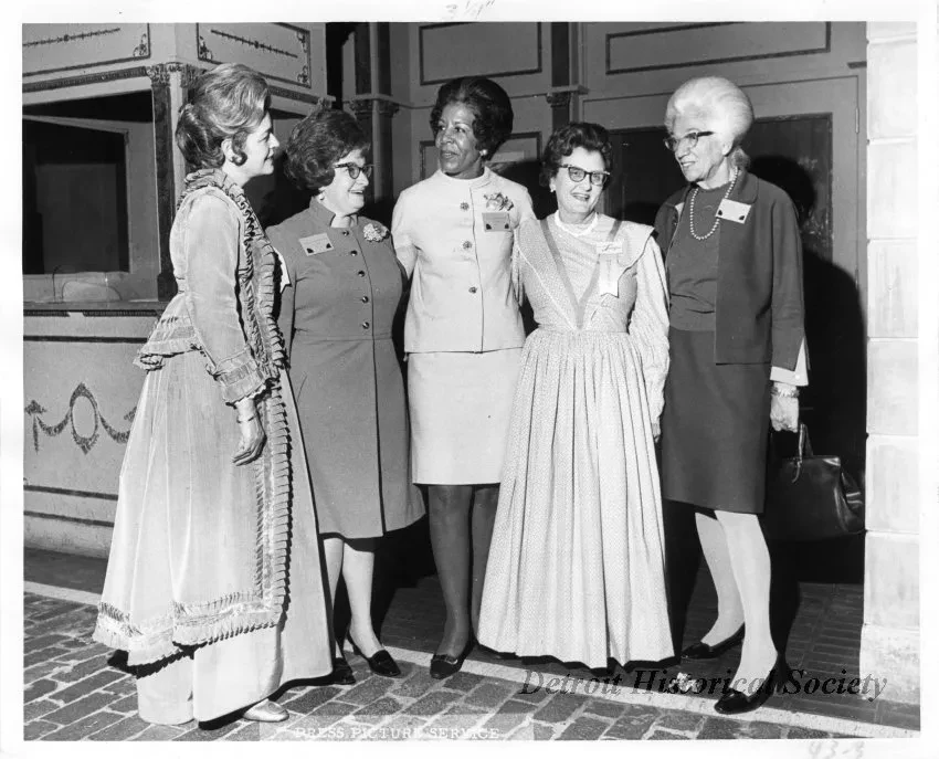 Black and white photographic print of the 1870 Tea Party held in March of 1970, five women, stand together in the Streets of Old Detroit, inside the Detroit Historical Museum. Two of the women are dressed in period clothing. Typed on the verso, "1870 Tea Party, March 18, 1970 - Detroit Historical Museum, honoring the Top Ten Women of Detroit, with members of the Detroit Historical Society Social Affairs Committee in Costumes of that Period. Left to right: Hostess, Mrs. Alfred M. Pelhem; Top Ten Margaret H. Lozeon and Carmen C. Murphy; Hostess, Mrs. Ivan Ludington, and Top Ten Dr. Sarah E. Schooten."