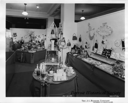 Print. Black and white photographic print of an interior retail space in the J.L. Hudson Company Department Store. Items featured in the retail space include various housewares as well as jewelry and handbags. Signage throughout the displays reads, "Gifts for Mother; Gifts for Grandfather." The date, photographic sequence number, company name and photographer's name are printed on the bottom of the recto and reads, "12-10-59; 28025-9x; The J.L. Hudson Company; Photography by Davis B. Hillmer."