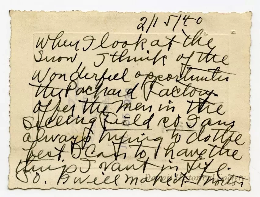 Black and white print of Packard master salesman C.L. Norton sitting in front of a cabin on what appears to be a beach. Written on recto of photograph: (see image 2)" When I look at the snow I think of the wonderful opportunities the Packard factory offer the men in the selling field so I am always trying to do the best I can to have the things I want in life. So. I will make it-Norton". Written on folder:" C.L. Norton-Boston". Date written on photograph: 2/15/1940. Date stamped on photograph: July 25, 1939.