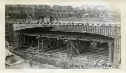 Photograph. Black and white photo showing the Davison Freeway under construction. The view shows several spectators or municipal officials who are looking over the side of the new bridge as timber formwork is being removed. A backhoe and several houses can be seen in the background. Handwritten text on the photo album page shows "Removing Falsework from Under Third Ave. Deck, 4-18-42."